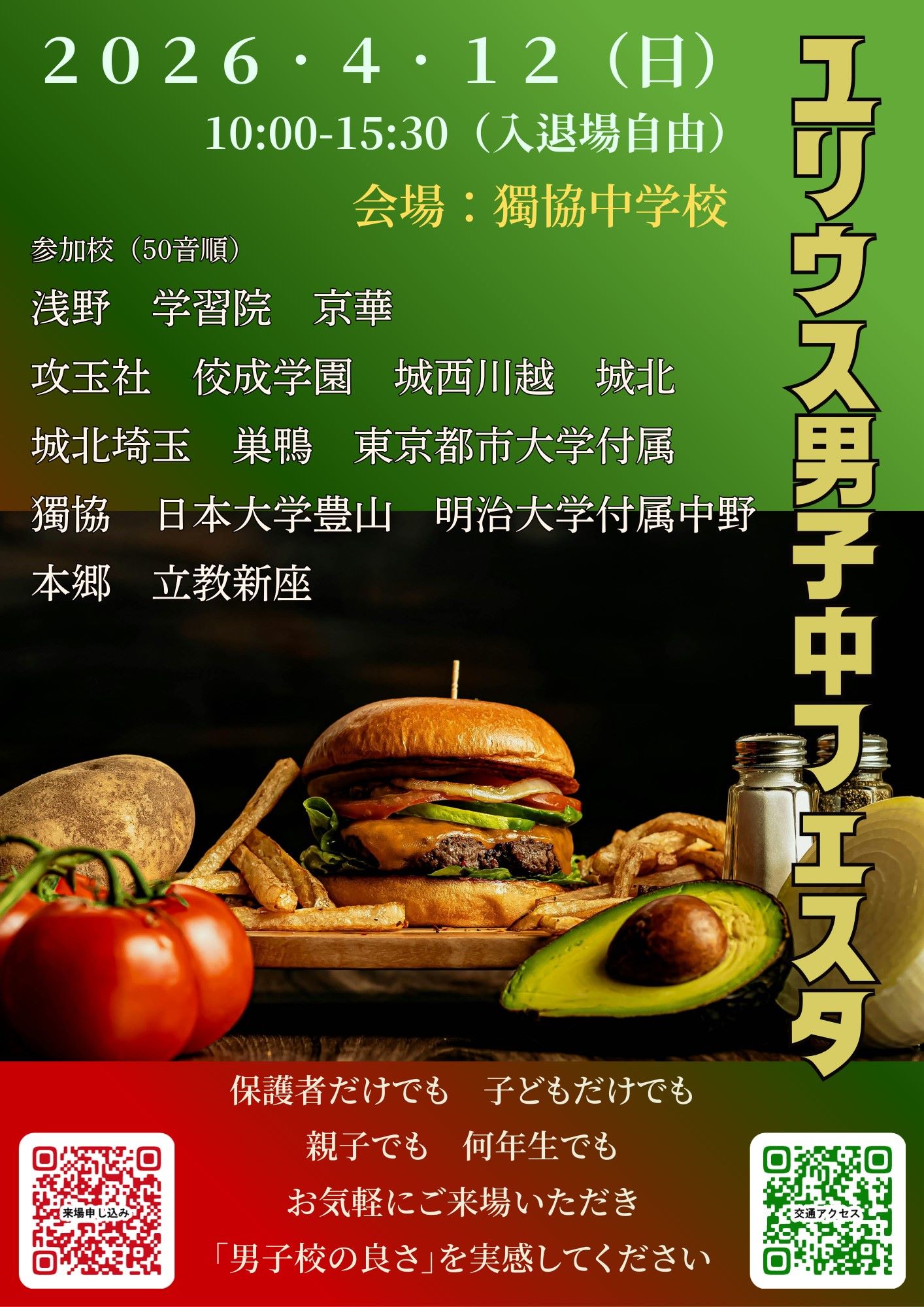 ユリウス男子中フェスタ(4月12日:獨協中学校)に参加いたします 2026/4/1 ユリウス男子中フェスタに参加いたします。 日時:4月12日(日)10::00-15:30 会場:獨協中学校 個別相談や様々な企画もございます。 事前予約制となっておりますので、 下記よりご登録いただき、ぜひお越しください! 事前予約はこちら ユリウス男子中フェスタポスター 関連記事 2026/04/01みらい子ども進学フェア(4/12:池袋)に参加します2026/02/132026年度 巣鴨高等学校 入試結果2026/02/112026(令和8)年度入試の出願状況について